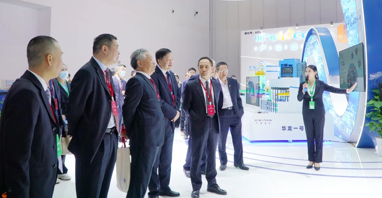 開幕式后,與會嘉賓來到中廣核展臺,聽取并了解中廣核近年來在“華龍一號”批量化建設、科技創新等方面的高質量發展成果。中央電視臺等媒體記者在展會現場,就中廣核科研創新成果“華龍一號”與“和睦系統”等進行采訪報道。